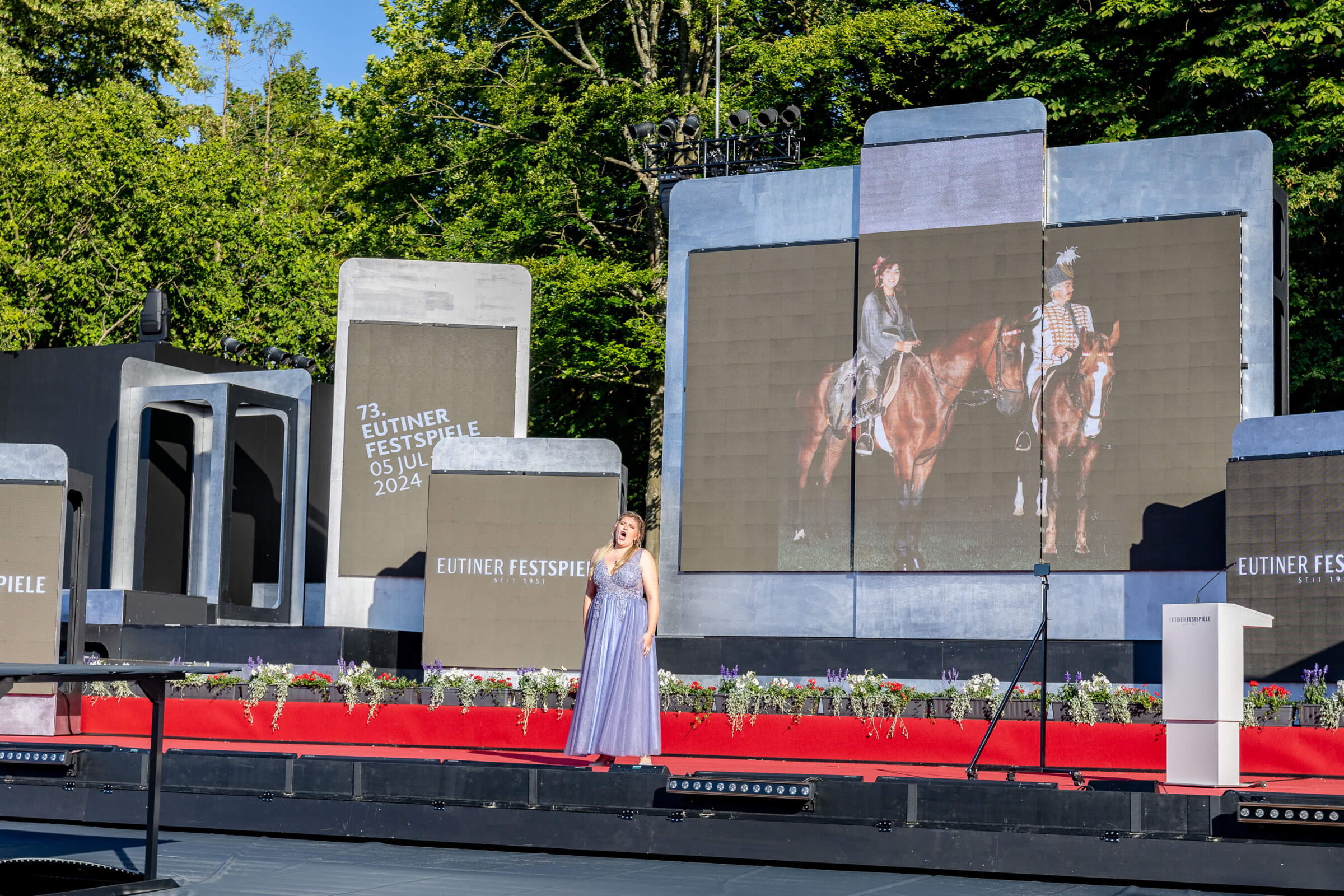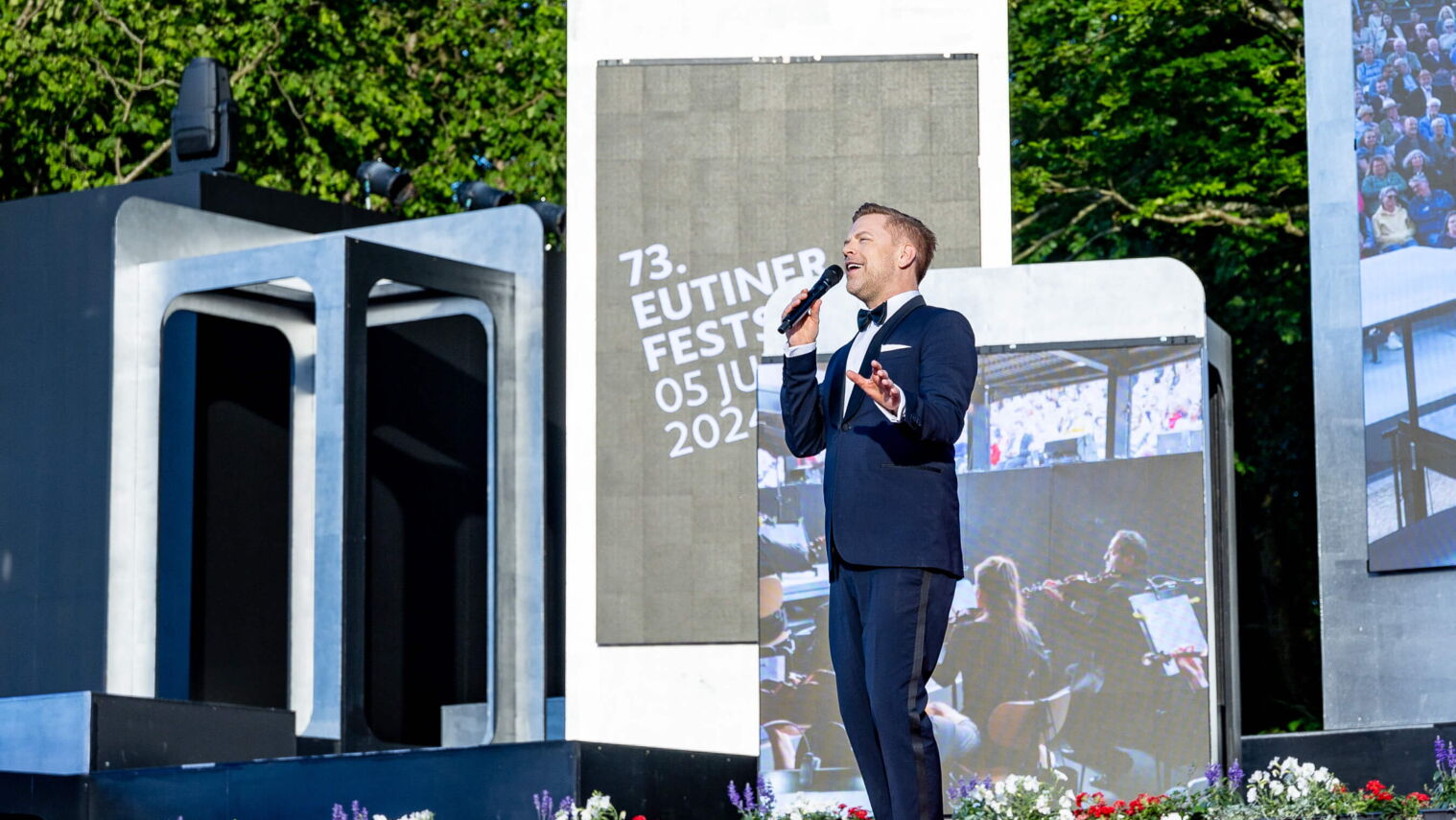 Herrliches Sommerwetter, erste Kostproben aus der neuen Freischütz-Inszenierung, viele prominente Redner und vor allem großes Lob für die neue Tribüne: So holperig der Weg zum Bau des neuen Schmuckstücks der Eutiner Festspiele und der ganzen Stadt auch war, so glanzvoll war die vom Sänger Tom Gaebel moderierte Eröffnung am Freitagabend, 28. Juni 2024.